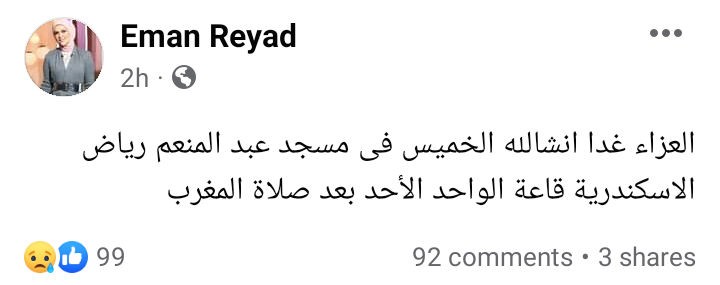 وكتبت إيمان رياض عبر حسابها الرسمي بموقع التواصل الاجتماعي فيسبوك: العزاء غدًا إن شاء الله الخميس في مسجد عبد المنعم رياض بالإسكندرية قاعة الواحد الأحد بعد صلاة المغرب.