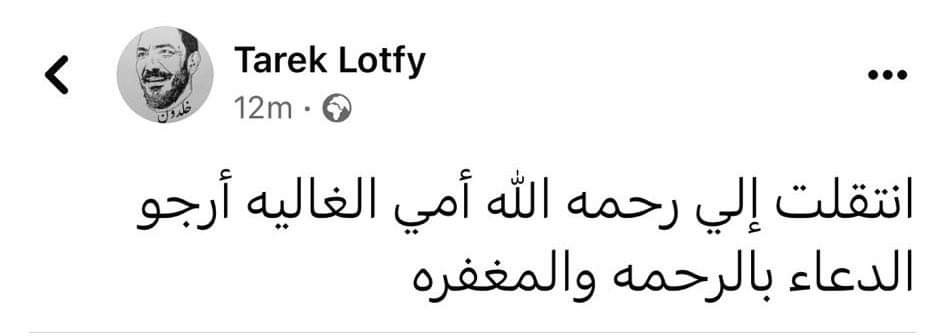 أعلن الفنان طارق لطفي عن وفاة والدته، وذلك قبل دقائق عبر حسابه الرسمي بموقع التواصل الإجتماعي فيسبوك.