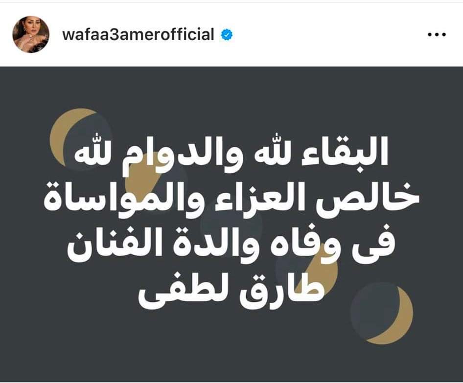 حرصت الفنانة وفاء عامر على نعي والدة الفنان طارق لطفي، التي رحلت عن عالمنا منذ ساعات قليلة.