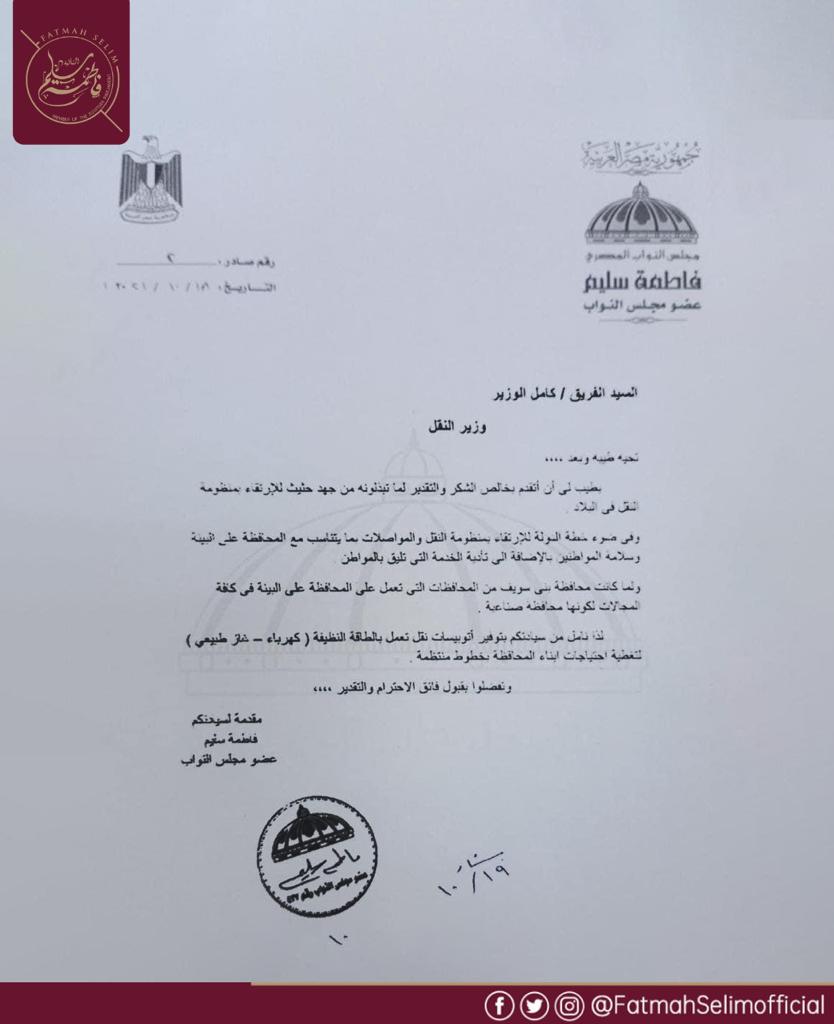 تلقت النائبة فاطمة سليم، عضو مجلس النواب، خطابا من الفريق المهندس كامل الوزير، وزير النقل والمواصلات، بشأن توفير أتوبيسات نقل تعمل بالطاقة النظيفة على الخطوط الداخلية لمحافظة بني سويف.