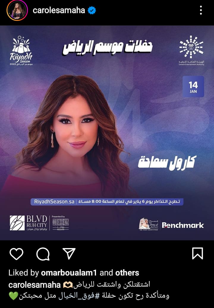 نشرت كارول سماحة بوستر حفلها في موسم الرياض عبر حسابها الرسمي بموقع تبادل الصور والفيديوهات انستجرام، وعلقت عليها، قائلا: اشتقتلكن واشتقت للرياض ومتأكدة رح تكون حفلة فوق الخيال متل محبتكم.