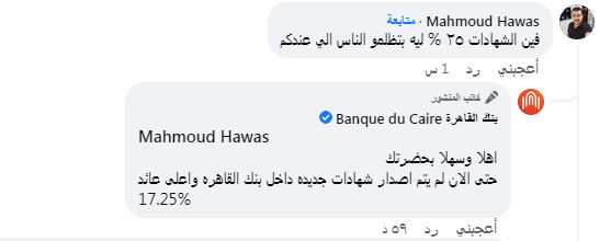 قال أحد عملاء بنك القاهرة في تعليق عبر صفحة المصرف الرسمية على العميل، "فين الشهادات ٢٥% ليه بتظلمو الناس اللى عندكم".