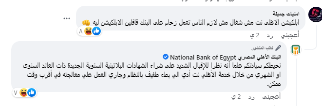 ورد موظف البنك الاهلى المصرى على العميل قائلاً: "نحيطكم سيادتكم علما أنه نظرا للإقبال الشديد على شراء الشهادات البلاتينية السنوية الجديدة ذات العائد السنوى او الشهري من خلال خدمة الأهلي نت أدي إلي بطء طفيف بالنظام وجاري العمل على معالجته في أقرب وقت ممكن".