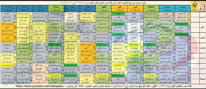 ننشر جدول عرض البرامج التعليمية الفنية على قناة مصر للتعليم الفني الفترة من 07-01-2023 الى 13-01-2023