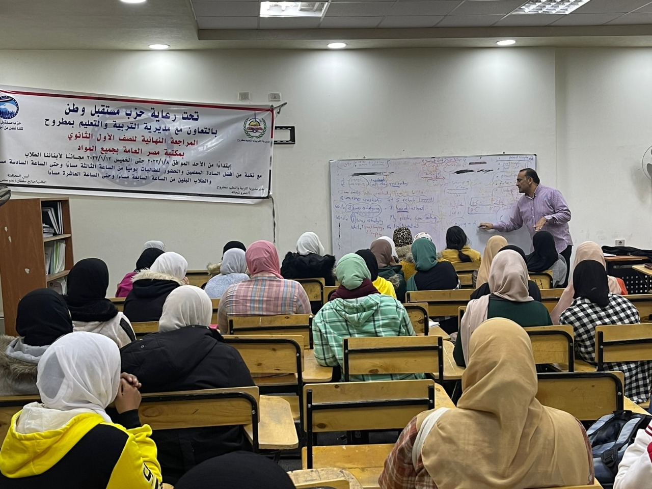 وفي محافظة مطروح أطلقت أمانة التعليم والبحث العلمي بالمحافظة، المراجعات النهائية المجانية، لطلاب وطالبات الصف الأول الثانوي، بالتعاون مع مديرية التربية والتعليم بالمحافظة، بمشاركة نخبة من أفضل المعلمين فى جميع المواد مقسمة على فترتين يوميا الفترة الأولي للطالبات من الساعة الثالثة عصراً إلى السادسة مساء، والفترة الثانية للطلاب من الساعة السابعة وحتى العاشرة مساء يومياً، في مكتبة مصر العامة، وبدأت فعاليات المراجعات أمس اليوم الأحد، وتنتهي يوم الخميس المقبل، مجانا بدون أي مقابل دعما من الحزب لأبنائنا الطلاب، وشهدت المراجعات إقبالاً كبيرا من الطلاب والطالبات .