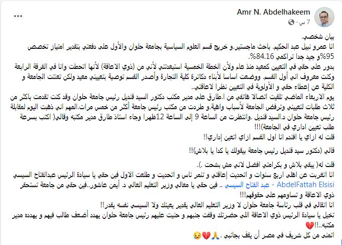 وجه عمرو نبيل عبد الحكيم، باحث ماجستير وخريج قسم العلوم السياسية بجامعة حلوان، استغاثة عاجلة لوزير التعليم العالي، بعد تجاهل الجامعة تعيينه كمعيد بكلية العلوم السياسية، رغم أنه الأول على القسم، لكونه من ذوي الإعاقة.