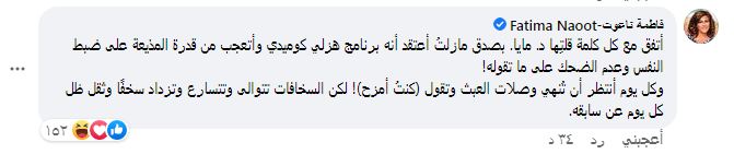 ومن جانبها علقت النائبة مايسة عطوة عضو مجلس النواب، قائلة:"احسنتي.. اللي مزعلني ي دكتورة أنها عارفه أنها تهان كل لحظة من الرجال قبل النساء ومازالت مستمرة.. ملعون الترند اللي يجعل منها أضحوكة الناس والعالم.. ربنا يهديها".