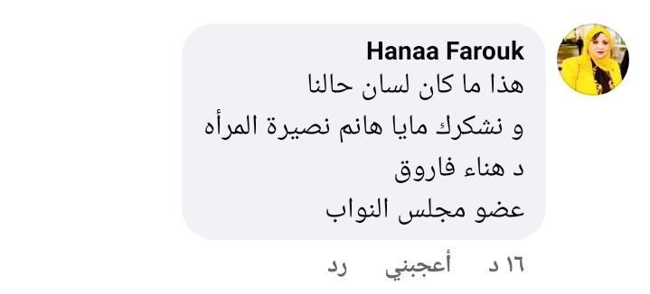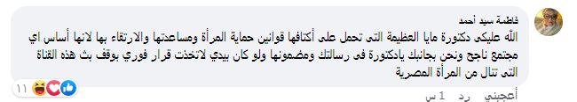 كما علقت النائبة هناء فاروق عضو مجلس النواب، قائلة:" هذا ما كان لسان حالنا ونشكرك مايا هانم نصيرة المرأة".