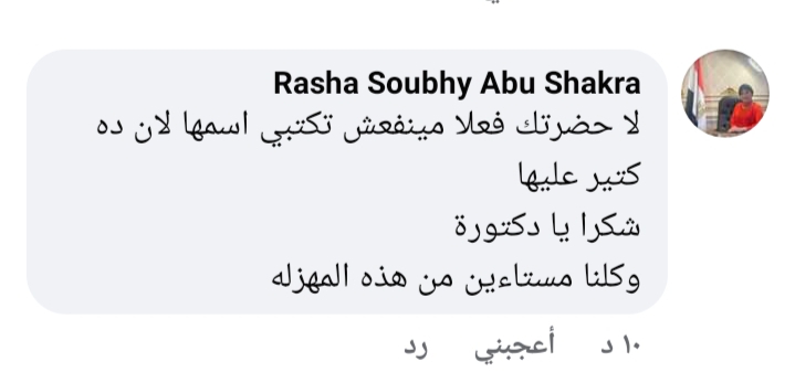 حيث علقت النائبة رشا أبو شقرة أمين سر لجنة الشئون الأفريقية بمجلس النواب عن تنسيقية شباب الأحزاب والسياسيين، قائلة:" لا حضرتك مينفعش تكتبي اسمها لأن ده كتير عليها.. شكرا يا دكتورة.. وكلنا مستائين من هذه المهزلة".