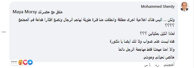 وردت عليه مايا مرسي: " يا فندم الموضوع مش هجوم حد على الثاني الموضوع محتوى !!!!اعلامي".