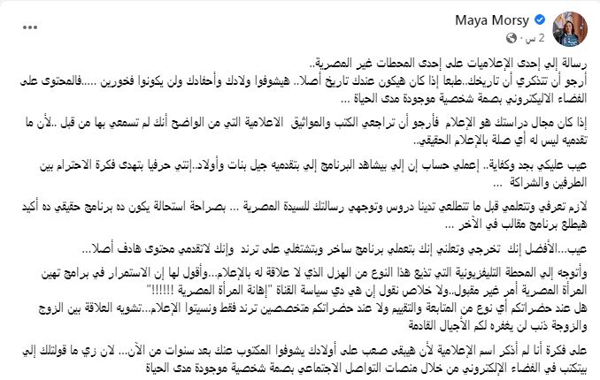 كما أيدتها الكاتبة الصحفية، فاطمة السيد، عضو مجلس أمناء الحوار الوطني، وكتب في تعليقها على منشور مايا مرسي: "الله عليكى دكتورة مايا العظيمة التى تحمل على أكتافها قوانين حماية المرأة ومساعدتها والارتقاء بها لانها أساس اي مجتمع ناجح ونحن بجانبك يادكتورة فى رسالتك ومضمونها ولو كان بيدي لاتخذت قرار فوري بوقف بث هذه القناة التى تنال من المرأة المصرية".