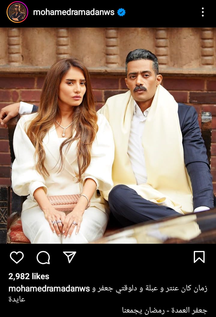 شارك محمد رمضان صورته بجانب زينة عبر حسابه الرسمي بموقع التواصل الإجتماعي “فيسبوك”: زمان كان عنتر وعبلة و دلوقتي جعفر وعايدة جعفر العمدة.. رمضان يجمعنا.