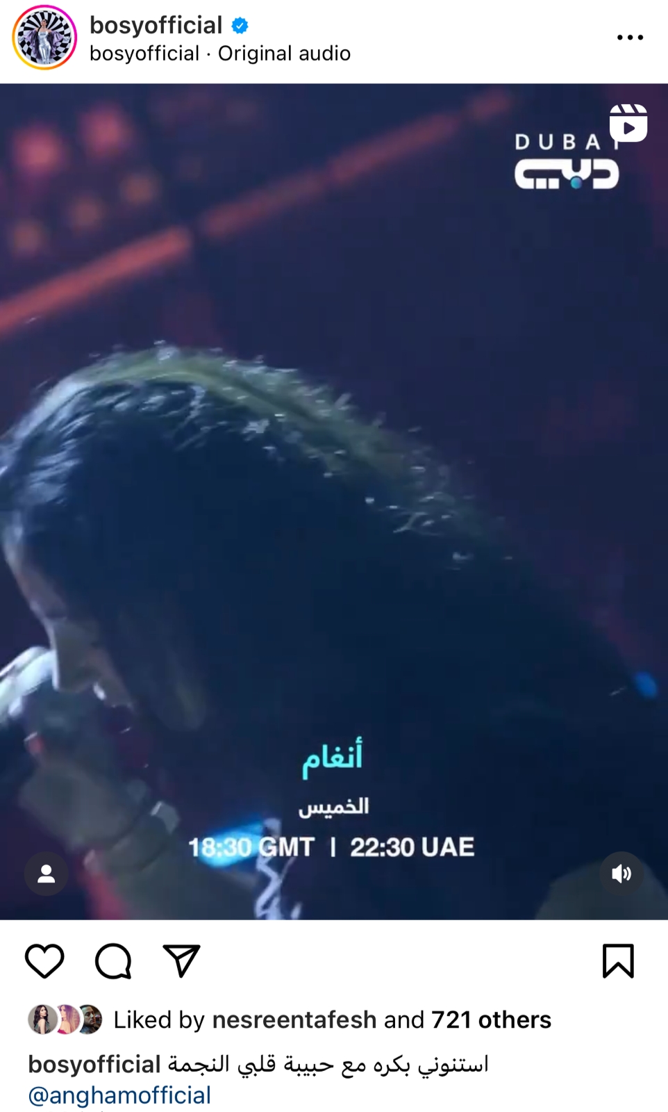 ونشرت بوسي مقطع يجمعها بأنغام، عبر حسابها الرسمي بموقع تبادل الصور والفيديوهات انستجرام، وعلقت: استنوني بكره مع حبيبة قلبي النجمة أنغام، على قناة دبي الساعة 8:30 بتوقيت مصر.