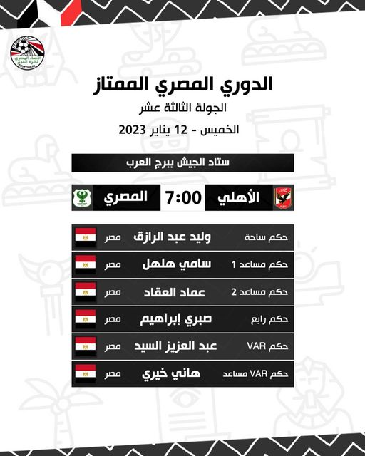 أعلنت لجنة الحكام الرئيسية برئاسة مارك كلاتنبرج، تعيين وليد عبد الرازق حكمًا لمواجهة الأهلي والمصري البورسعيدي غدًا في بطولة الدوري المصري، خلال المواجهة التي تجمع بين الفريقين على ستاد الجيش ببرج العرب ضمن منافسات الجولة الثالثة عشر من بطولة الدوري المصري الممتاز.