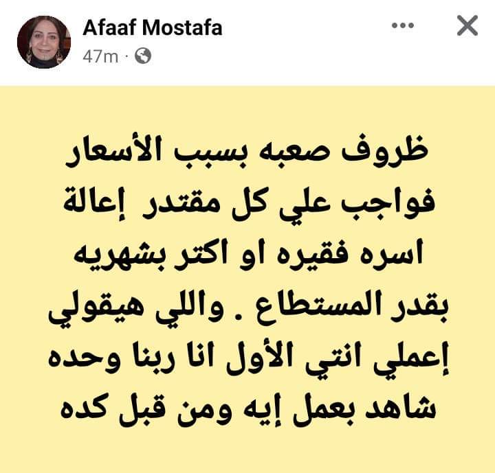 وكتبت عفاف مصطفى: ظروف صعبه بسبب الأسعار فواجب علي كل مقتدر إعالة اسره فقيره او اكتر بشهريه بقدر المستطاع.