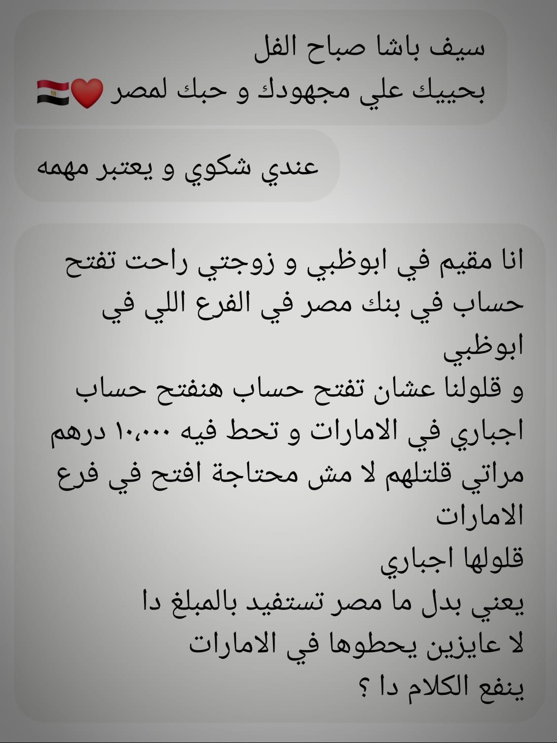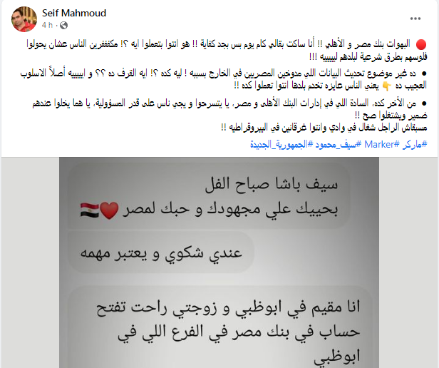 قال سيف محمود عبر صفحته الشخصية على موقع "فيسبوك"،: "بنك مصر و الأهلي أنا ساكت بقالي كام يوم بس بجد كفاية !! هو انتوا بتعملوا إيه مكفرين الناس عشان يحولوا فلوسهم بطرق شرعية لبلدهم ليه".