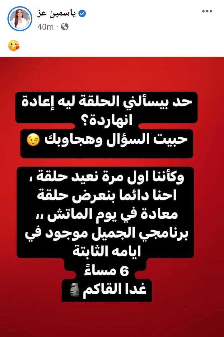 وكتبت ياسمين عز عبر حسابها الرسمي بموقع التواصل الإجتماعي “فيسبوك”: "حد بيسالني الحلقة أية إعادة النهارده ؟ حبيت السؤال وهجاوبك وكأننا أول مرة نعيد حلقة دائما بمعرض حلقه معادة في يوم الماتش برنامجي الجميل موجود في أيامه الثابتة ٦ مساء غدا ألقاكم ".