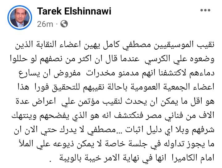 كتب طارق الشناوي عبر حسابه الرسمي بموقع التواصل الإجتماعي “فيسبوك”: نقيب الموسيقيين مصطفي كامل يهين اعضاء النقابة الذين وضعوه علي الكرسي عندما قال ان اكثر من نصفهم لو حللوا دماءهم لاكتشفنا انهم مدمنو مخدرات مفروض ان يسارع اعضاء الجمعية العمومية باحالة نقيبهم للتحقيق فورا هذا هو اقل ما يمكن ان يحدث لنقيب مؤتمن علي اعراض عدة الاف من فناني مصر فنكتشف انه هو الذي يفضحهم وينتهك شرفهم وبلا اي دليل اثبات.