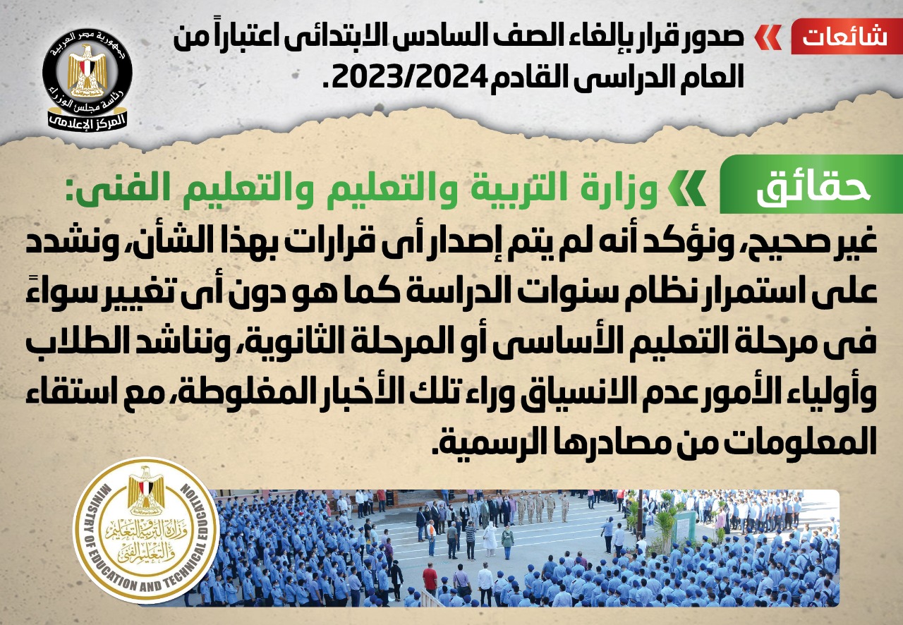 وقام المركز الإعلامي لمجلس الوزراء بالتواصل مع وزارة التربية والتعليم والتعليم الفني، والتي نفت تلك الأنباء، مُؤكدةً أنه لا صحة لإلغاء الصف السادس الابتدائي اعتباراً من العام الدراسي القادم 2023/2024، وأنه لم يتم إصدار أي قرارات بهذا الشأن، مُشددةً على استمرار نظام سنوات الدراسة كما هو دون أي تغيير سواءً في مرحلة التعليم الأساسي أو المرحلة الثانوية، مُناشدةً الطلاب وأولياء الأمور عدم الانسياق وراء تلك الأخبار المغلوطة، مع استقاء المعلومات من مصادرها الرسمية.