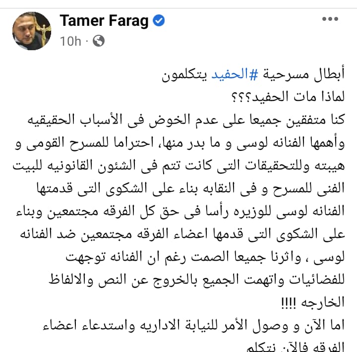 كتب تامر فرج عبر حسابه الرسمي بموقع التواصل الإجتماعي “فيسبوك”: أبطال مسرحية الحفيد يتكلمون لماذا مات الحفيد؟ كنا متفقين جميعا على عدم الخوض فى الأسباب الحقيقيه وأهمها الفنانه لوسى و ما بدر منها، احتراما للمسرح القومي وهيبته وللتحقيقات التى كانت تتم فى الشئون القانونية للبيت الفني للمسرح و في النقابة.