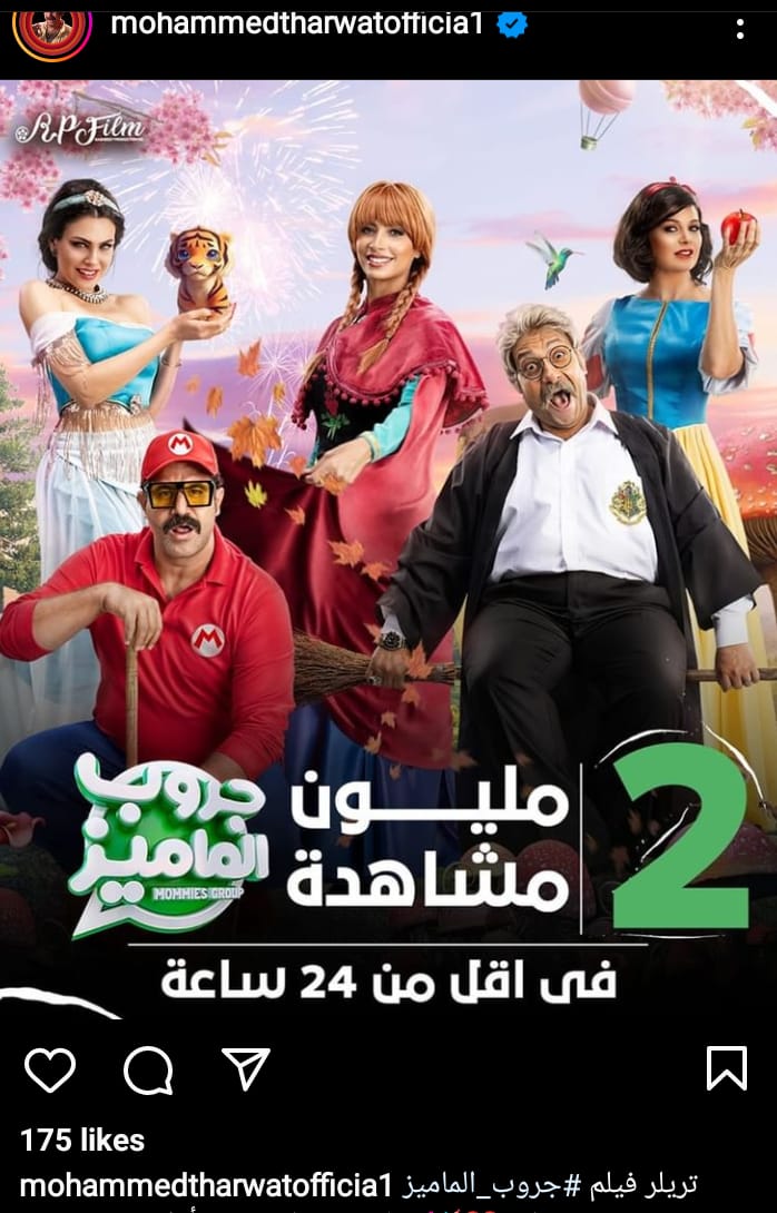 واحتفل الفنان محمد ثروت أحد أبطال فيلم جروب الماميز بنجاح التريلر الدعائي للعمل رغم عدم مرور 24 ساعة من طرحه على موقع الفيديوهات الشهير “يوتيوب”، ناشرة بوستر فيلم جروب الماميز وعلق عليه: تريلر فيلم جروب الماميز يحقق 2 مليون مشاهدة في أقل من 24 ساعة.