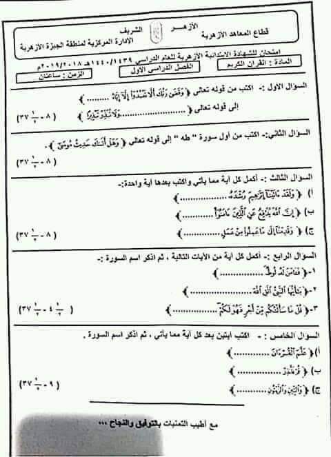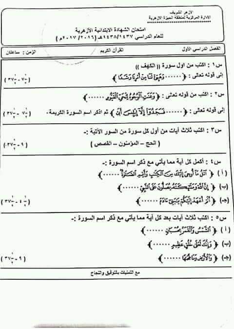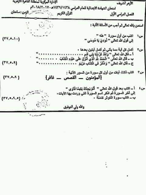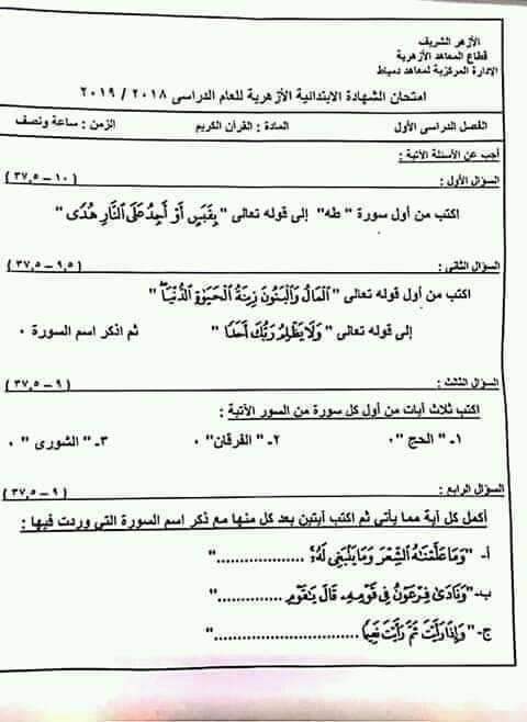 ومن المقرر أن تبدأ امتحانات الصف السادس الابتدائي، وتكون درجة امتحان القرآن الكريم ستكون من 37.5 فى الامتحان التحريري و12.5 فى الامتحان الشفوي، حيث ان نظام امتحانات الازهر يختلف عن نظام امتحانات التربية والتعليم.
