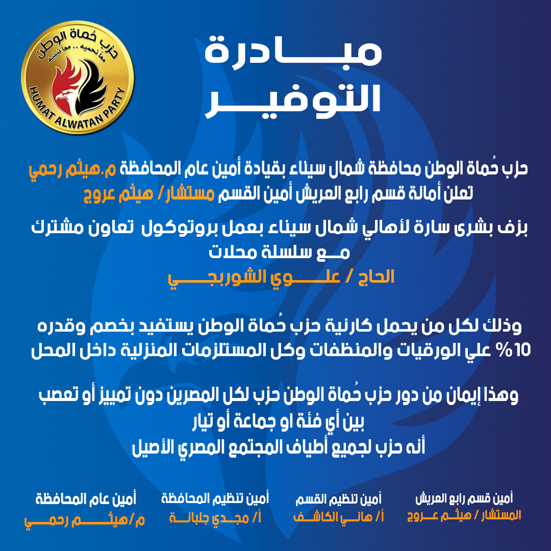 أطلق حزب حماة الوطن، أمانة محافظة شمال سيناء، مبادرة التوفير التى دشنتها أمانة قسم رابع العريش بقيادة المستشار هيثم عروج.