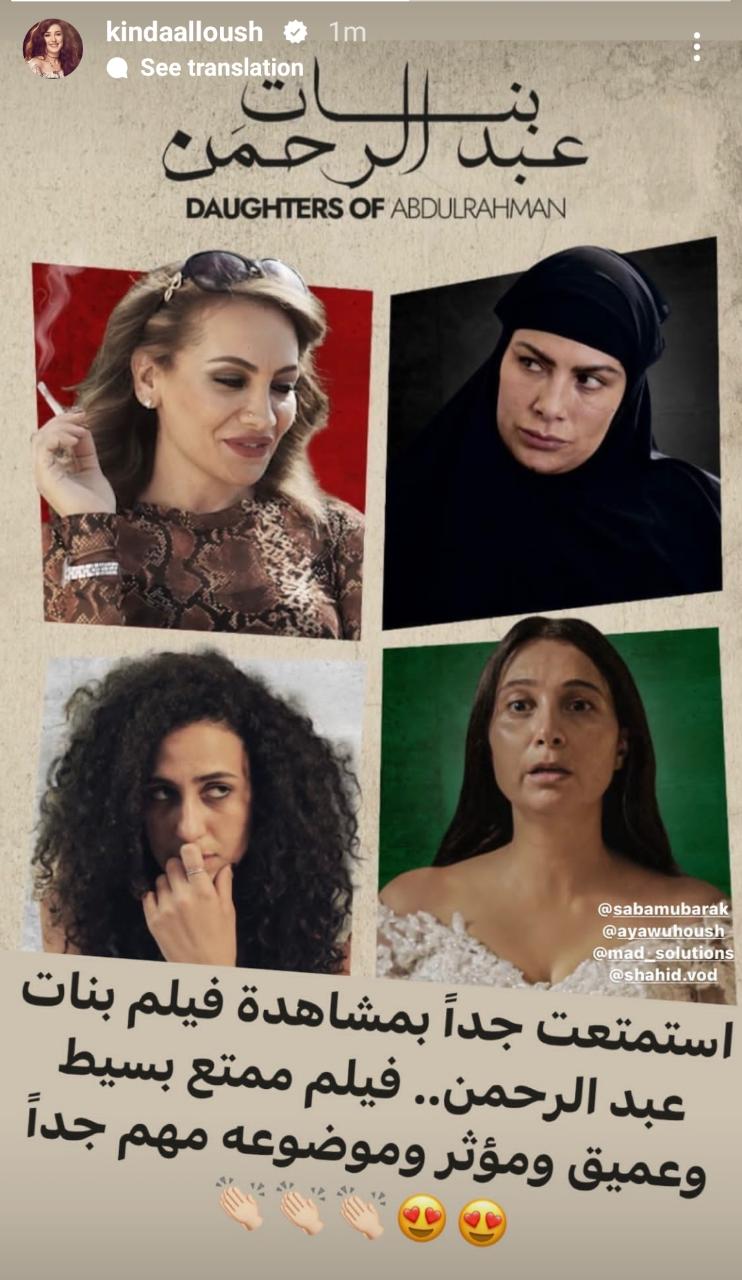 حيث نشرت كندة علوش بوستر الفيلم من خلال خاصية “إستوري”، وكتبت عليه: “استمتعت جدًا بمشاهدة فيلم بنات عبد الرحمن.. فيلم ممتع بسيط عميق ومؤثر وموضوعه مهم جدًا”.