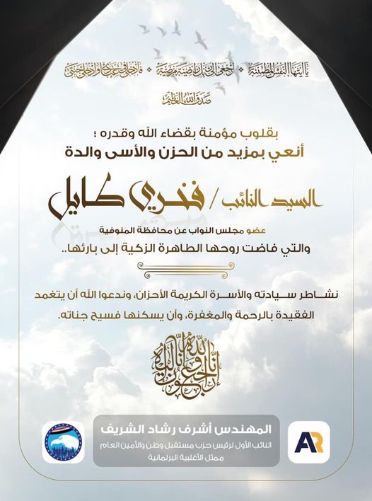 وأضاف المهندس أشرف رشاد، عبر صفحته الشخصية "فيسبوك": نشاطره والأسرة الكريمة الأحزان، وندعو الله أن يتغمد الفقيدة بالرحمة والمغفرة، وأن يسكنها فسيح جناته.