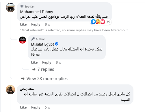 قال أحد عملاء اتصالات مصر في تعليق عبر صفحة المصرف الرسمية على موقع "فيسبوك"،: "اقسم بالله خدمة العملاء سيئة فودافون احسن منهم بمراحل".
