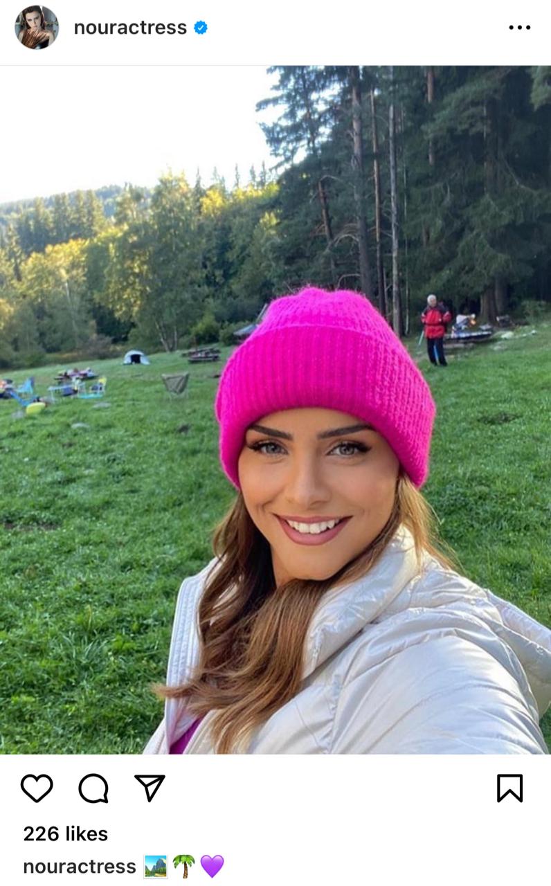 وظهرت نور بإطلالة شتوية، تتكون من آيس كاب باللون الفوشيا، وچاكيت شتوي أبيض في صورة من النوع السيلفي، مما نال إعجاب متابعيها.