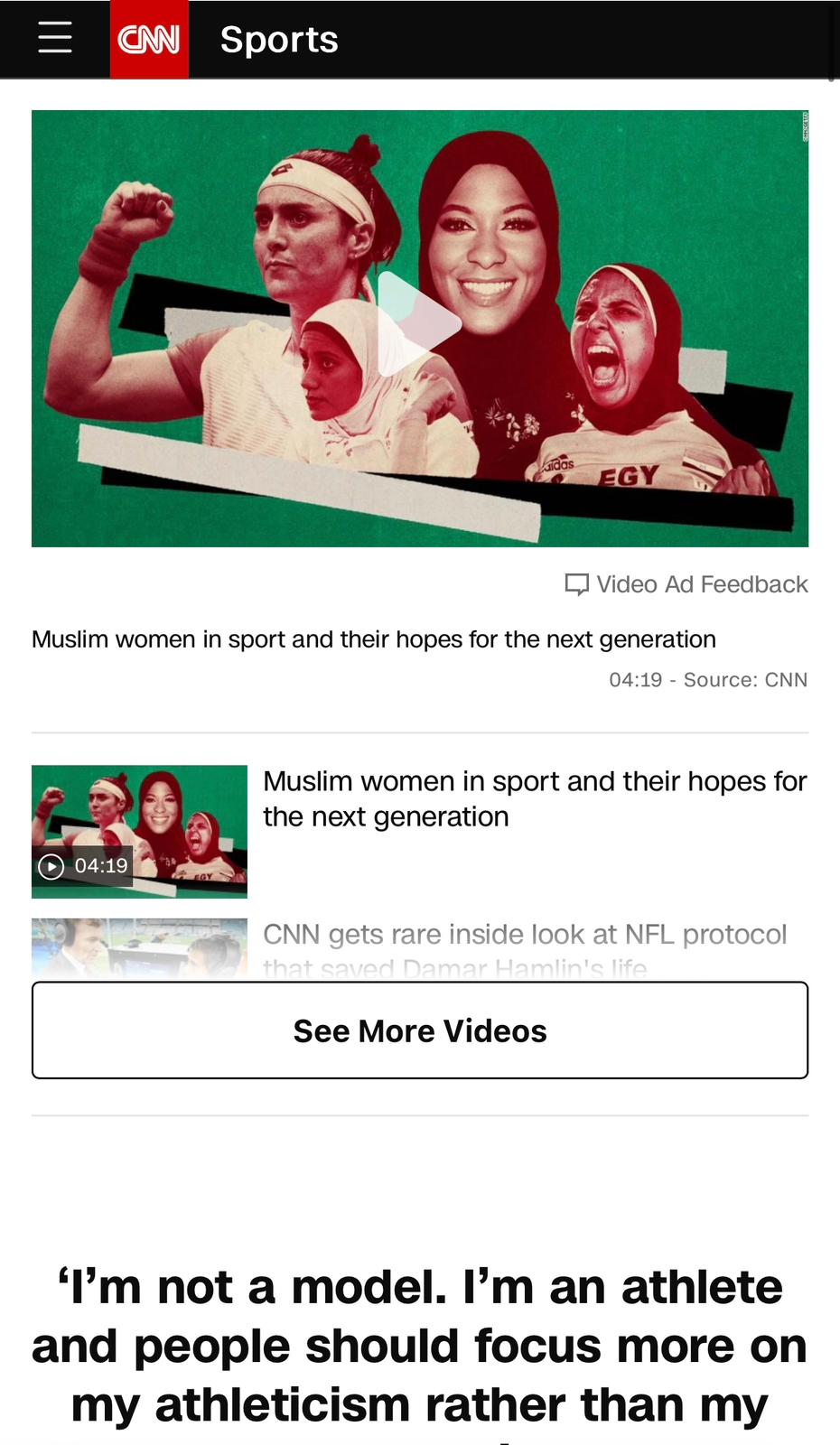 أجرت شبكة " CNN sports " حوار مع النائبة آية مدني، عضو مجلس النواب عن تنسيقية شباب الأحزاب والسياسيين، في تقرير بعنوان"المرأة المسلمة في الرياضة وآمالها للجيل القادم" والذي ضم الحديث عن أربع شخصيات نسائية رياضية مسلمة مؤثرة في الوسط الرياضي الدولي، وهم البطلة الأولمبية المصرية السابقة في الخماسي الحديث آية مدني، ولاعبة التنس التونسية أُنس جابر، ولاعبة المبارزة الأمريكية ابتهاج محمد، ولاعبة الكرة الطائرة الشاطئية المصرية دعاء الغباشي.