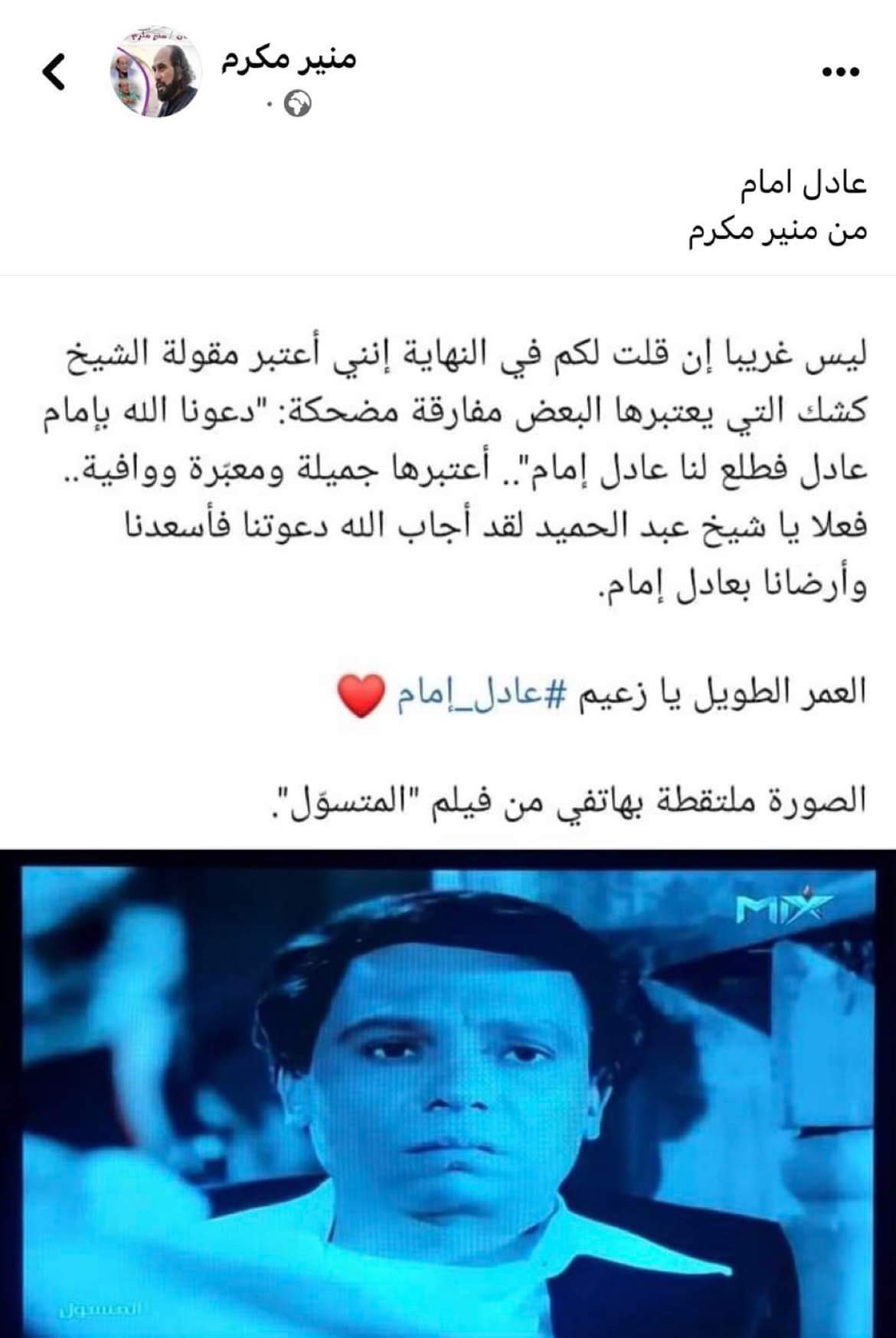 وكتب منير مكرم: ليس غريبًا إن قلت لكم في النهاية إنني أعتبر مقولة الشيخ كشك التي يعتبرها البعض مقارنة مضحكة: "دعونا الله بإمام فطلع لنا عادل إمام" اعتبرها جميلة ومعبرة ووافية.