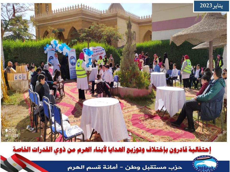 كما نظمت أمانة قسم الهرم، احتفالية "قادرون باختلاف" لإدخال البهجة على الأطفال ذوي القدرات الخاصة في جو من البهجة والسعادة، وتضمن برنامج الحفل الألعاب الترفيهية بمشاركة أبنائنا وبناتنا من ذوي القدرات الخاصة، وفقرة للتنورة، كما تم تقديم عرض بعنوان لآ للتنمر قدموه أبنائنا ذوي الهمم، وتم توزيع الهدايا على الأطفال المشاركين بالاحتفالية.