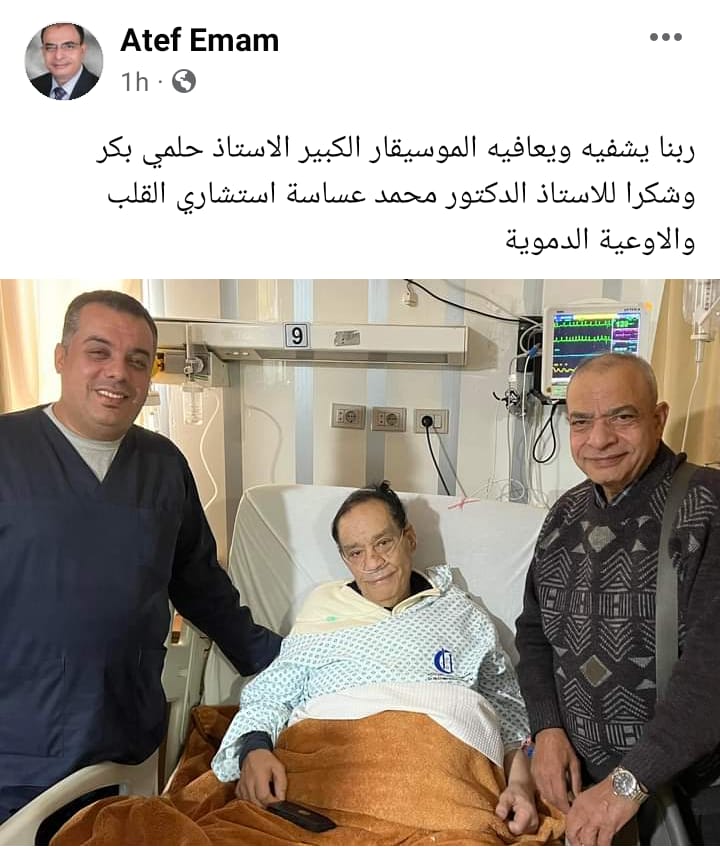 وشارك عاطف إمام رئيس معهد الموسيقى العربية السابق، صورة لـ حلمي بكر من داخل المستشفى مطالبا الجمهور بالدعاء له بالشفاء، اذ كتب عبر حسابه الرسمي بموقع التواصل الإجتماعي “فيسبوك”: ربنا يشفيه ويعافيه الموسيقار الكبير الاستاذ حلمي بكر وشكرا للاستاذ الدكتور محمد عساسة استشاري القلب والاوعية الدموية.