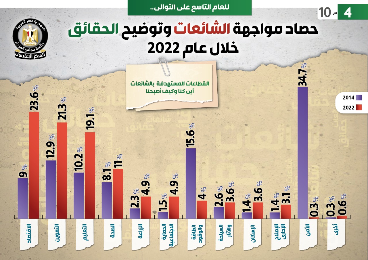 يأتي هذا فيما بلغت الشائعات المتعلقة بالطاقة والوقود 4% عام 2022، مقارنة بـ 15.6% عام 2014، والسياحة والآثار 3.6% عام 2022 مقارنة بـ 2.6% عام 2014، والإسكان 3.6% عام 2022، مقارنة بـ 1.4% عام 2014، والإصلاح الإداري 3.1% عام 2022، مقابل 1.4% عام 2014، والأمن 0.3% عام 2022، مقابل 34.7 %عام 2014، فيما سجلت القطاعات الأخرى 0.6% عام 2022، مقارنة بـ 0.3% عام 2014.