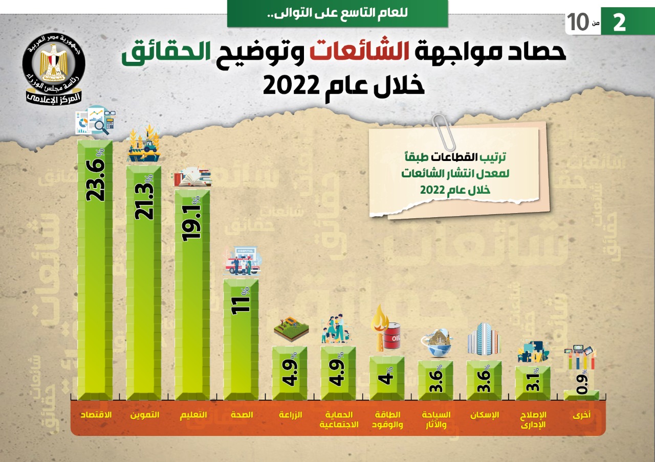 وورد في التقرير الحديث عن ترتيب القطاعات طبقاً لمعدل انتشار الشائعات خلال 2022، حيث جاءت النسبة الأكبر من الشائعات متعلقة بالاقتصاد بمعدل 23.6% والتموين 21.3%، والتعليم 19.1%، والصحة 11%، وكل من الزراعة والحماية الاجتماعية 4.9%، والطاقة والوقود 4%، وكل من السياحة والآثار، والإسكان 3.6%، والإصلاح الإداري 3.1%، فيما جاءت نسبة الشائعات المتعلقة بقطاعات أخرى 0.9%.