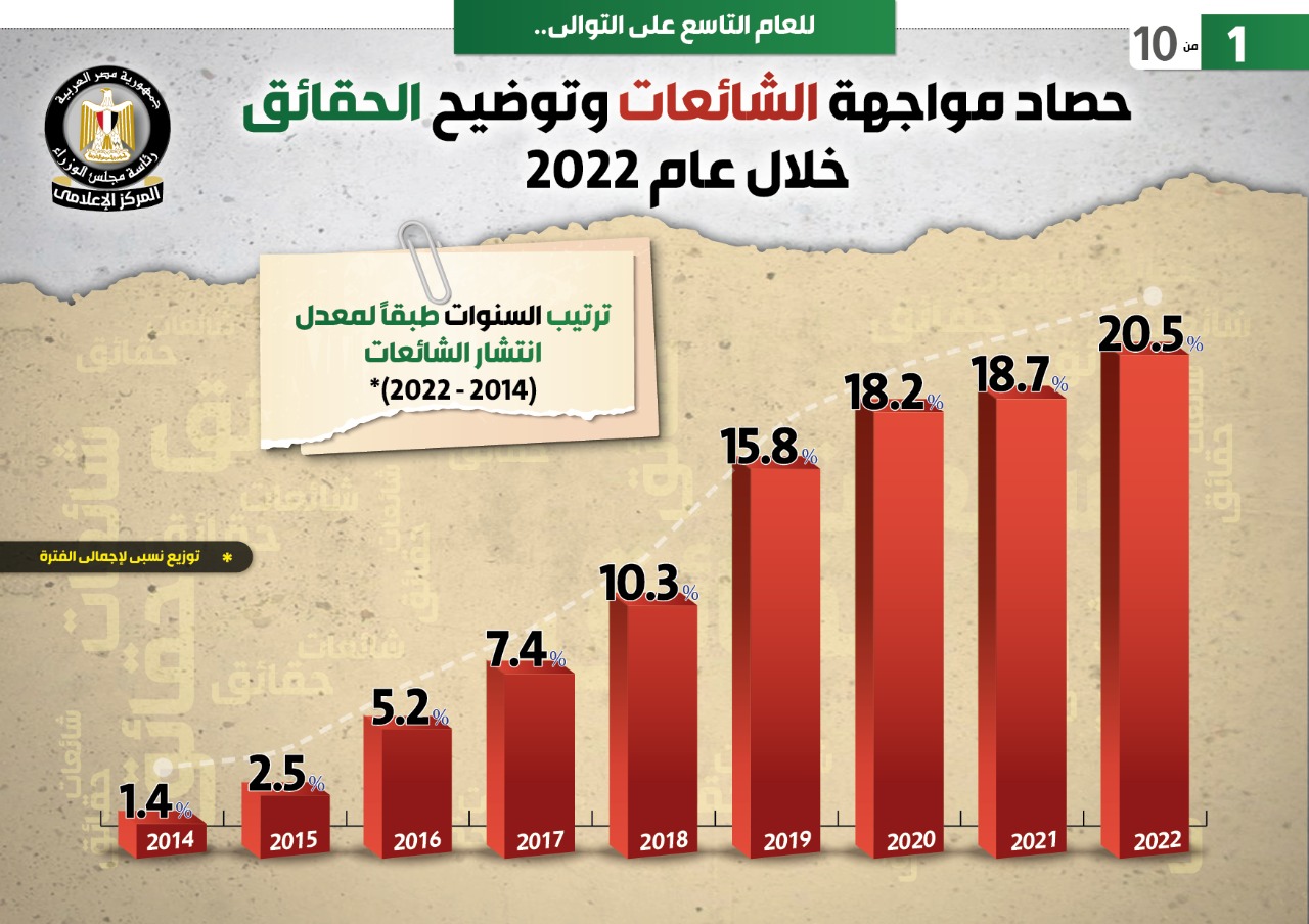 واستعرض التقرير ترتيب السنوات طبقاً لمعدل انتشار الشائعات (2014 - 2022) وفقاً لتوزيع نسبي لإجمالي الفترة، حيث بلغ 20.5%عام 2022، مقارنة بـ 18.7% عام 2021، و18.2% عام 2020، و15.8% عام 2019، و10.3% عام 2018، و7.4% عام 2017، و5.2% عام 2016، و2.5% عام 2015، و1.4% عام 2014.