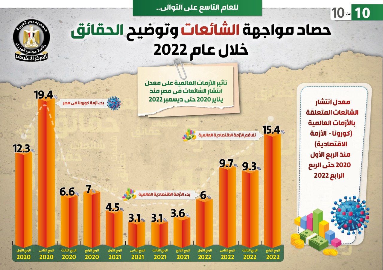 واستعرض التقرير معدل انتشار الشائعات المتعلقة بالأزمات العالمية (كورونا – الأزمة الاقتصادية) منذ الربع الأول 2020 حتى الربع الرابع 2022، حيث بلغت 12.3% في الربع الأول 2020، و19.4% في الربع الثاني 2020 والمرتبط ببدء أزمة كورونا في مصر، و6.6% في الربع الثالث من نفس العام، و7% في الربع الرابع من العام ذاته.