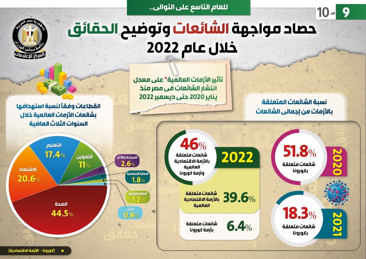 وتطرق التقرير إلى تأثير الأزمات العالمية (كورونا – الأزمة الاقتصادية) على معدل انتشار الشائعات في مصر منذ يناير 2020 حتى ديسمبر 2022، حيث بلغت نسبة الشائعات المتعلقة بكورونا 51.8% عام 2020، مقارنة بـ 18.3% عام 2021، بينما بلغت نسبة الشائعات المتعلقة بأزمة كورونا والأزمة الاقتصادية العالمية 46% خلال عام 2022، منها 39.6% الشائعات المتعلقة بالأزمة الاقتصادية العالمية، و6.4% الشائعات المتعلقة بأزمة كورونا.
