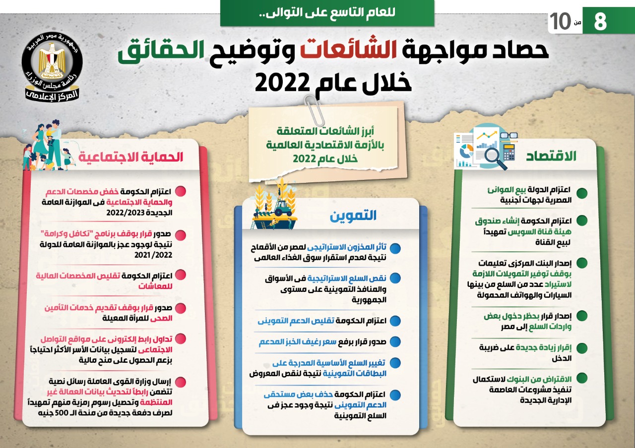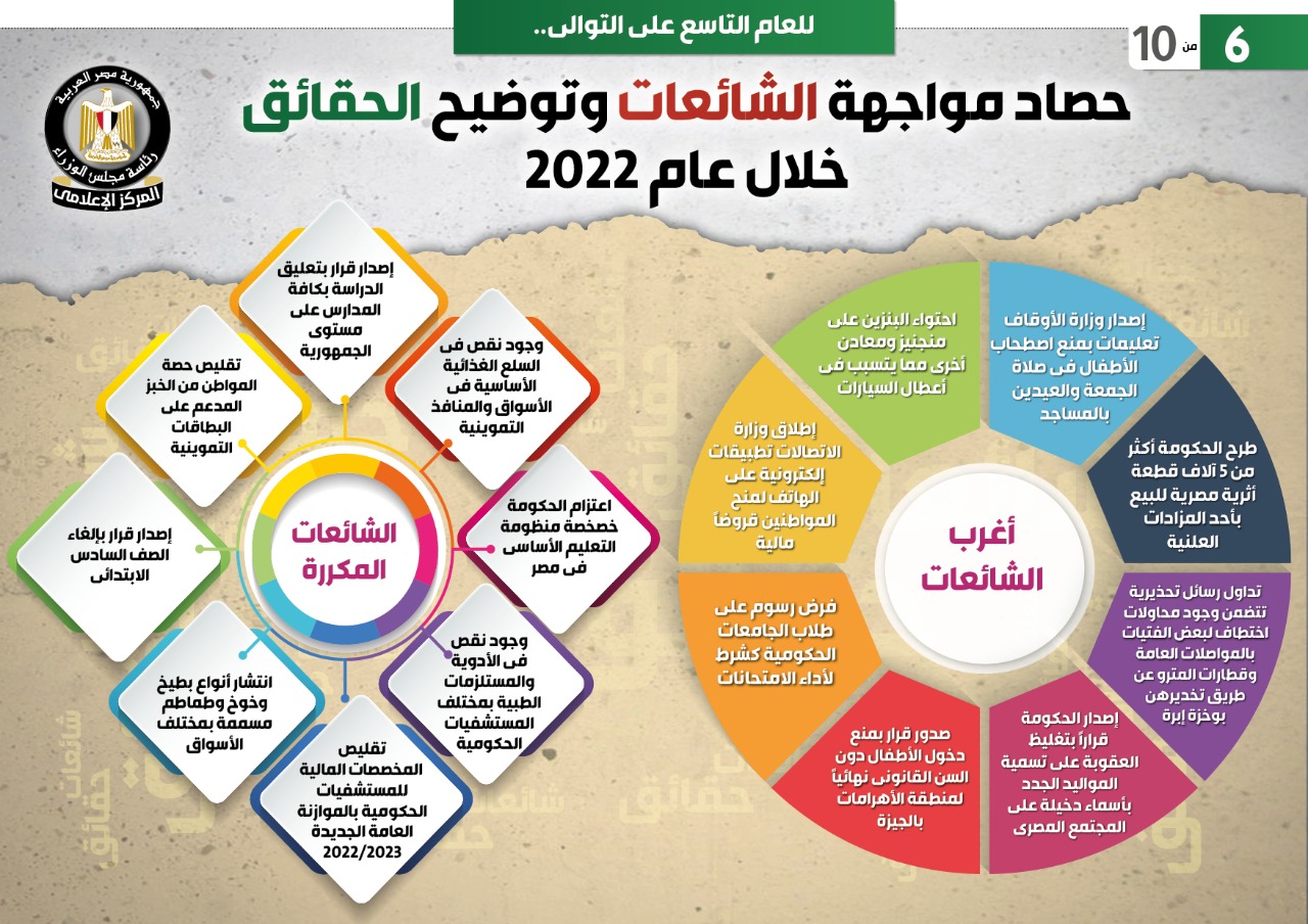 نشر المركز الإعلامي لمجلس الوزراء تقريراً تضمن إنفوجرافات تتناول حصاد مواجهة الشائعات وتوضيح الحقائق خلال عام 2022.