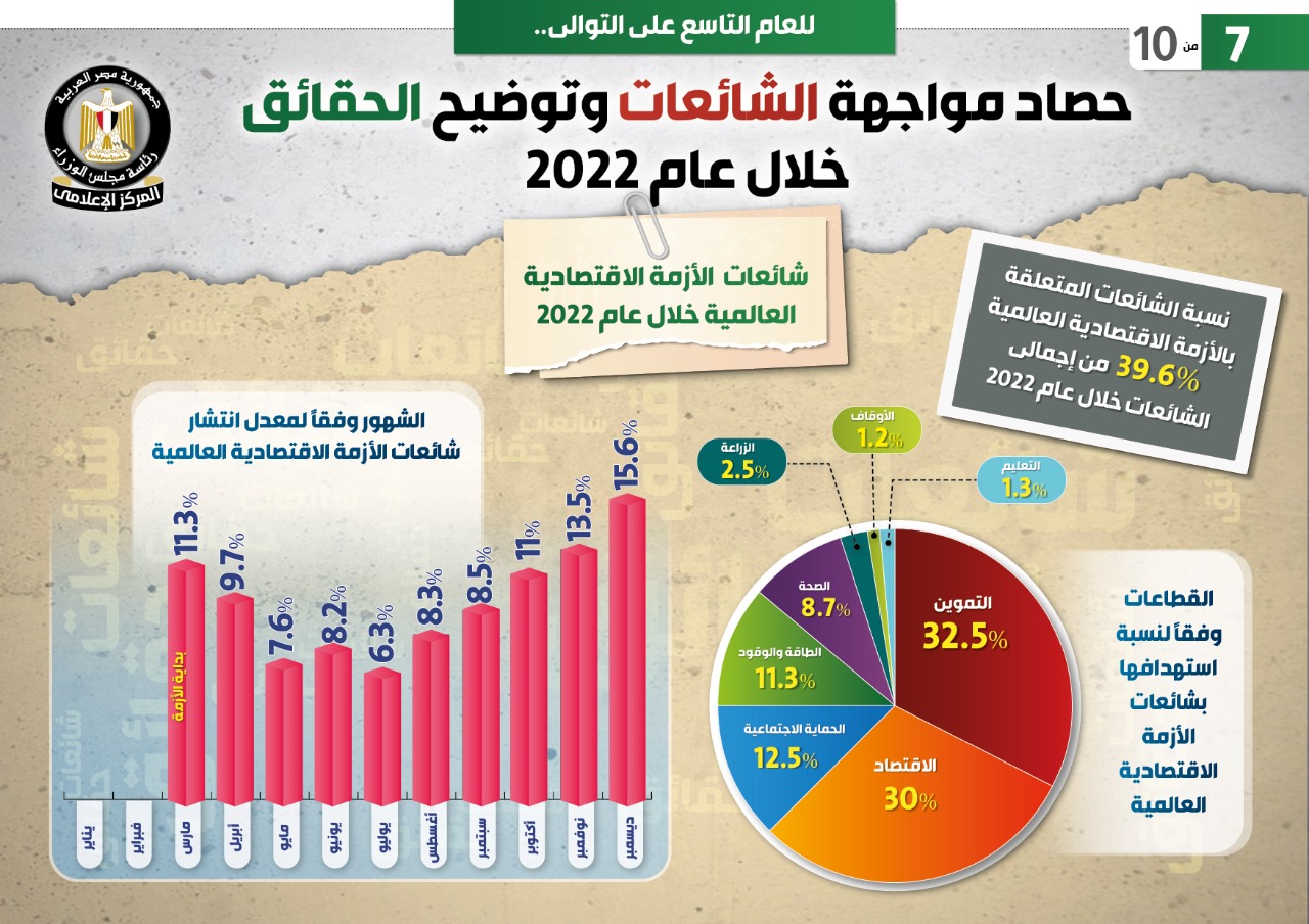 وبالنسبة لشائعات الأزمة الاقتصادية العالمية خلال 2022، فقد ذكر التقرير أن نسبة الشائعات المتعلقة بالأزمة الاقتصادية العالمية بلغت 39.6% من إجمالي الشائعات خلال عام 2022، موضحاً نسب استهدافها للقطاعات بالدولة، حيث جاءت نسبة الشائعات المتعلقة بالتموين 32.5%، والاقتصاد 30%، والحماية الاجتماعية 12.5%، والطاقة والوقود 11.3%، والصحة 8.7%، بينما بلغت معدلات الشائعات المتعلقة بالزراعة 2.5%، والأوقاف 1.2%، والتعليم 1.3%.