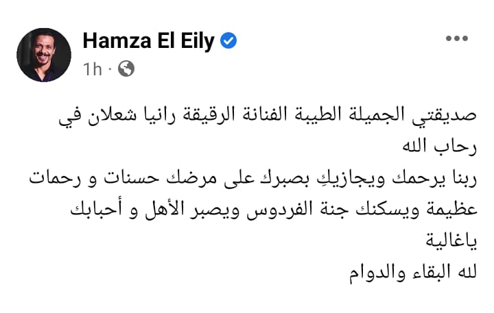 ونعي الفنان حمزة العيلي الفنانة الراحلة رانيا شعلان من خلال حسابه الرسمي بموقع التواصل الإجتماعي “فيسبوك”، اذ كتب: صديقتي الجميلة الطيبة الفنانة الرقيقة رانيا شعلان في رحاب الله ربنا يرحمك ويجازيكِ بصبرك على مرضك حسنات و رحمات عظيمة ويسكنك جنة الفردوس ويصبر الأهل و أحبابك ياغالية لله البقاء والدوام.