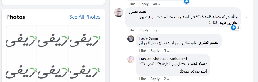 انتقد عميل شركة ريفى في تعليق عبر صفحة الشركة الرسمية على موقع "فيسبوك"، قائلاً :"والله شركه نصابة فايدة 25% فى السنة ولنا جيت أسدد بعد أربع شهور عاوزين فايدة 5800".