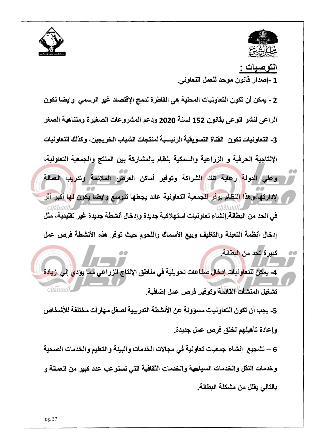 الدراسة تضمنت توصيات منها إصدار قانون موحد للعمل التعاونى حيث من الممكن أن تكون التعاونيات القاطرة لدمج الاقتصادى غير الرسمى ونشر الوعى بقانون المشروعات ومن الممكن أن تكون التعاونيات القناة التسويقية لمنتجات الشباب الخريجين وكذلك التعاونيات الإنتاجية الحرفية والزراعية والسمكية بنظام المشاركة بين المنتج والجمعية التعاونية وأيضا إدخال صناعات تحويلية فى مناطق الإنتاج الزراعى مما يؤدى إلى زيادة تشغيل المنشأت القائمة وتوفير فرص عمل إضافية .