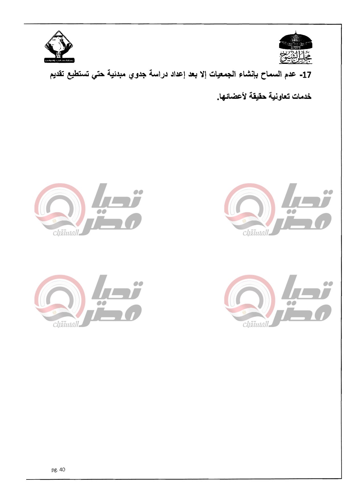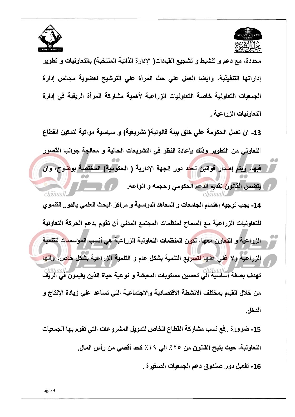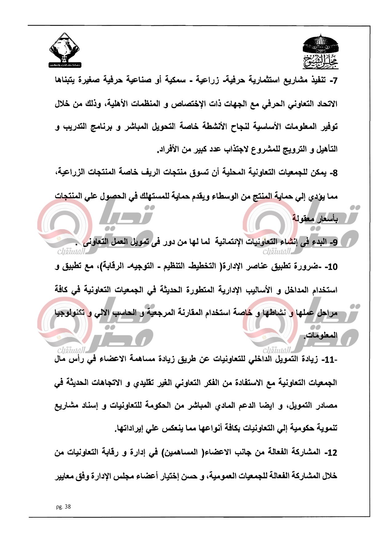 ينشر موقع تحيا مصر، نص الدراسة المقدمة من النائب أكمل نجاتى، أمين سر لجنة الشئون المالية والاقتصادية بمجلس الشيوخ عن تنسيقية شباب الأحزاب والسياسيين، بشأن تفعيل دور التعاونيات فى مصر، والتى تتعرض لمعوقات وتحديات خلال الفترة الأخيرة وخاصة التعاوينات الزراعية حيث إرتفاع الفائدة التمويلية من البنك الزراعى المصرى ووصلت لـ 13% ولا تزال قابلة للزيادة، وأيضا التعدى على الأراضى الزراعية سواء بالبناء عليها أو تجريفها أو تبويرها.
