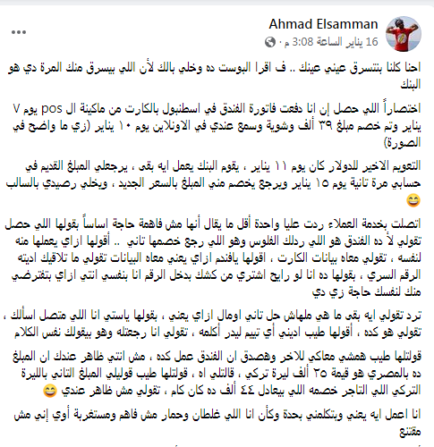 وأضاف: "اختصاراً اللي حصل إن انا دفعت فاتورة الفندق في اسطنبول بالكارت من ماكينة ال pos يوم ٧ يناير وتم خصم مبلغ ٣٩ ألف وشوية وسمع عندي في الاونلاين يوم ١٠ يناير (زي ما واضح في الصورة) ".
