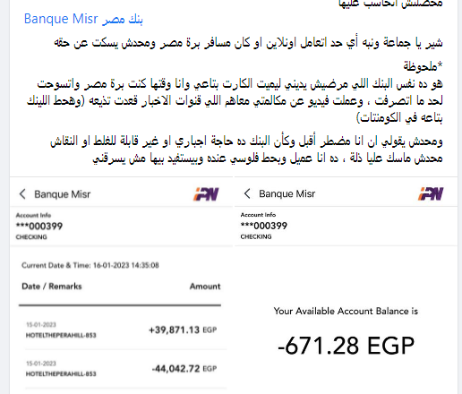 قال أحد عملاء بنك مصر في تعليق عبر صفحته الشخصية موقع "فيسبوك"،: "إحنا كلنا بنتسرق عيني عينك، فأقرا البوست ده وخلي بالك لأن اللي بيسرق منك المرة دي هو البنك".