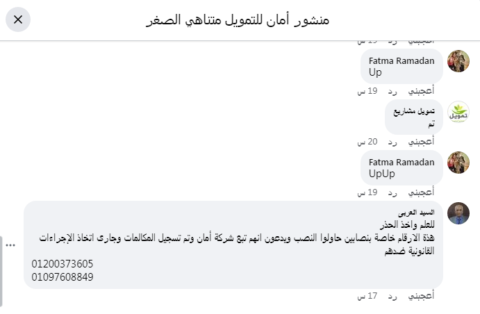 وقال أحد عملاء شركة أمان عبر صفحة الشركة الرسمية على موقع "فيسبوك"،: "للعلم واخذ الحذر، هذه الأرقام خاصة بنصابين حاولوا النصب ويدعون انهم تبع شركة أمان وتم تسجيل المكالمات وجارى اتخاذ الإجراءات القانونية ضدهم 01200373605- 01097608849".