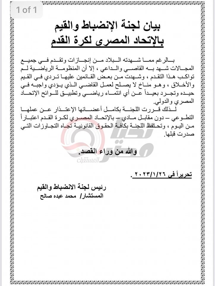 لذلك قررت اللجنة بكامل أعضائها الاعتذار عن عملها التطوعي دون مقابل مادي بالاتحاد المصري لكرة القدم، اعتبارًا من اليوم، وتحتفظ اللجنة بكافة الحقوق القانونية تجاه التجاوزات التي صدرت قبلها.